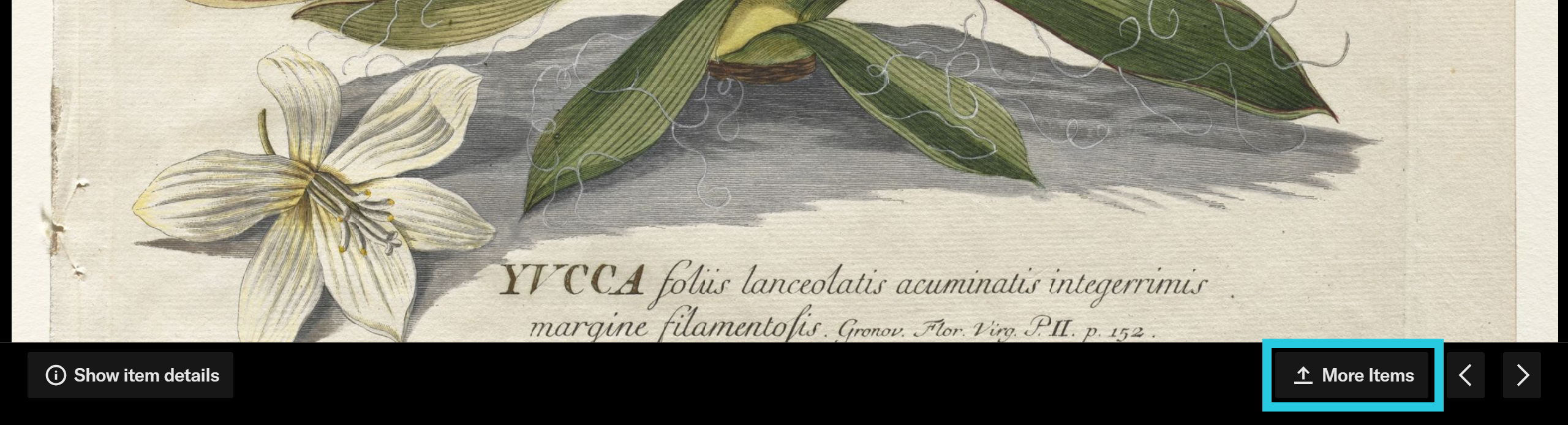 To compare items from your Workspace or search results alongside your original item, use the More items button. See Using Compare Mode for JSTOR Images for more information.